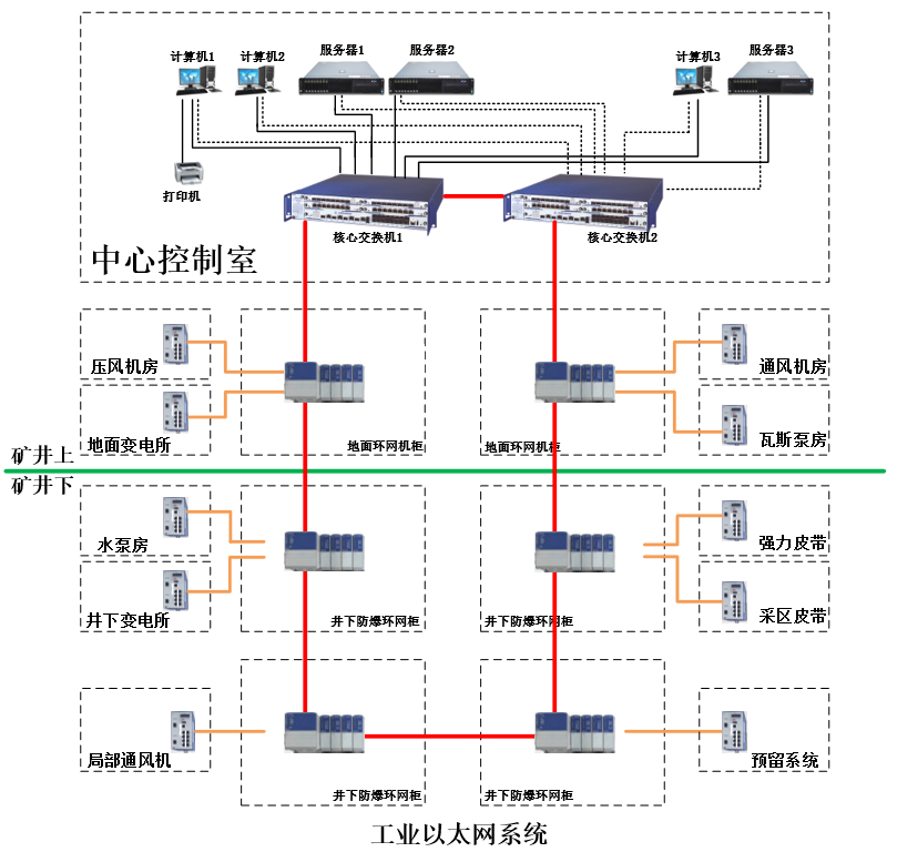 礦井工業(yè)以太網(wǎng)作為智慧礦山建設(shè)的重要組成部分,承擔(dān)著信息傳輸?shù)闹匾蝿?wù)。安全、可靠、快速的礦井工業(yè)以太環(huán)網(wǎng),能夠?yàn)榈V井采掘、運(yùn)輸、供電、通風(fēng)、壓風(fēng)、排水、提升、瓦斯抽采等自動(dòng)化子系統(tǒng)以及視頻監(jiān)控系統(tǒng)提供一個(gè)完美的信息傳輸平臺(tái),為礦井自動(dòng)化、信息化建設(shè)提供網(wǎng)絡(luò)支撐。