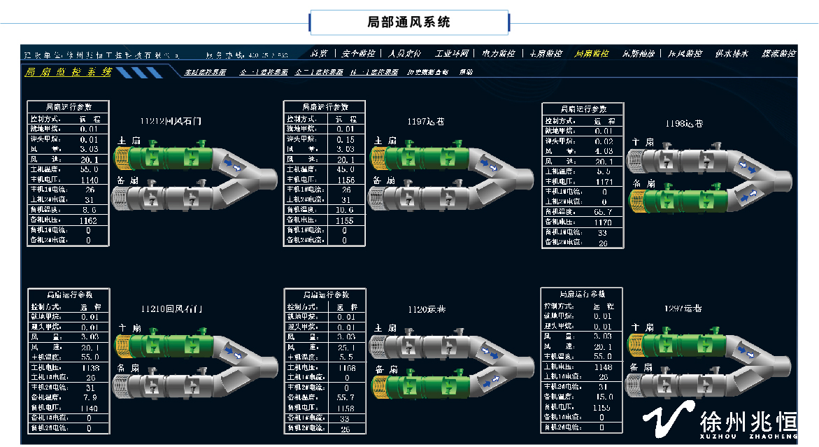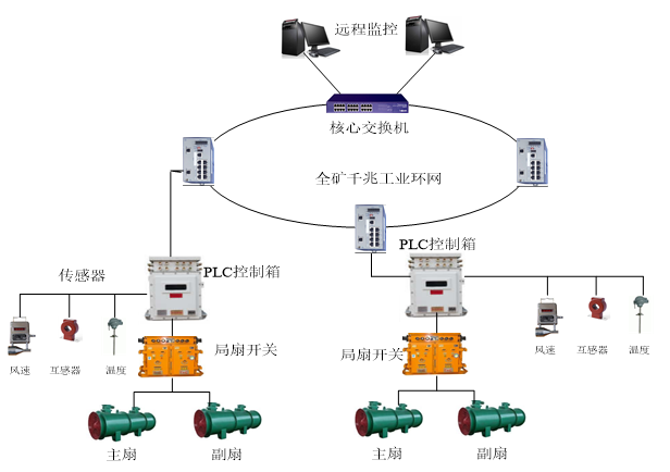 我公司研發(fā)的局部通風(fēng)機智能控制系統(tǒng)實現(xiàn)了用地面監(jiān)控計算機對井下局部通風(fēng)機的啟??刂?;每天定時自動對主備風(fēng)機進(jìn)行切換實驗;能夠在主風(fēng)機因故障停車時自動切換至備用風(fēng)機,并在主風(fēng)機回復(fù)正常后停止備用風(fēng)機恢復(fù)主風(fēng)機的工作;能夠?qū)︼L(fēng)機運行狀態(tài)、瓦斯?jié)舛?、風(fēng)速進(jìn)行監(jiān)測;地面監(jiān)控軟件能夠記錄局扇風(fēng)機運行和試驗的歷史資料;能夠?qū)⑷V局扇的運行信息通過局域網(wǎng)傳送給有權(quán)瀏覽的用戶。