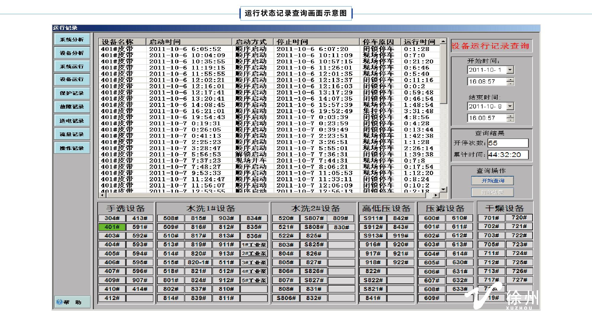 14)設(shè)備運行記錄:實時記錄設(shè)備的開停狀況,能查詢1年內(nèi)的設(shè)備的開停情況,并自動累計運行時間,開停次數(shù)等。記錄內(nèi)容包括:設(shè)備名稱、開車時間、開車方式、停車時間、停車原因、運行時間等。