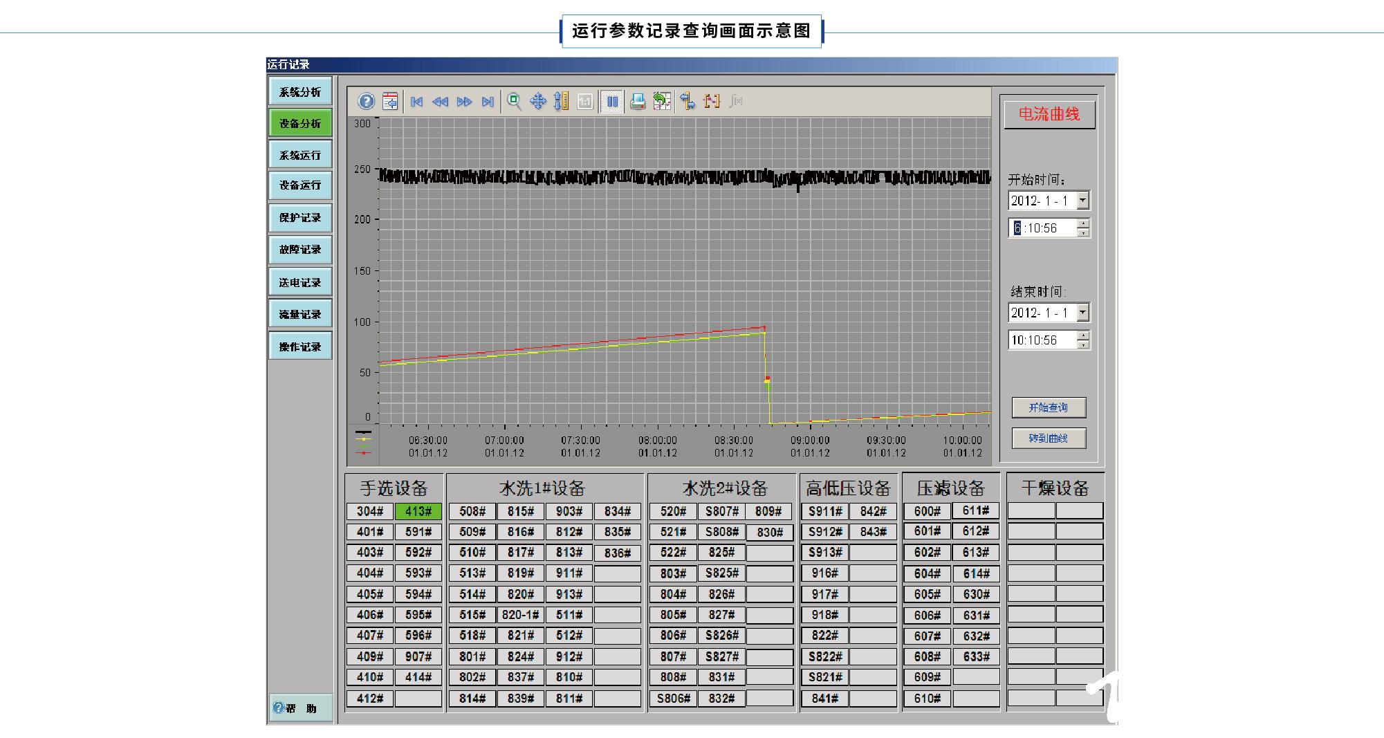 11)設(shè)備故障分析:當(dāng)設(shè)備停車時,系統(tǒng)能自動判斷停車原因。主要停車原因如下:電機保護故障停車、皮帶保護故障停車、現(xiàn)場停車、閉鎖停車、掉電停車、集控停車、自動停車、流程停車、系統(tǒng)急停等,其中,電機保護故障能具體到故障原因,皮帶保護故障具體到故障的位置。
