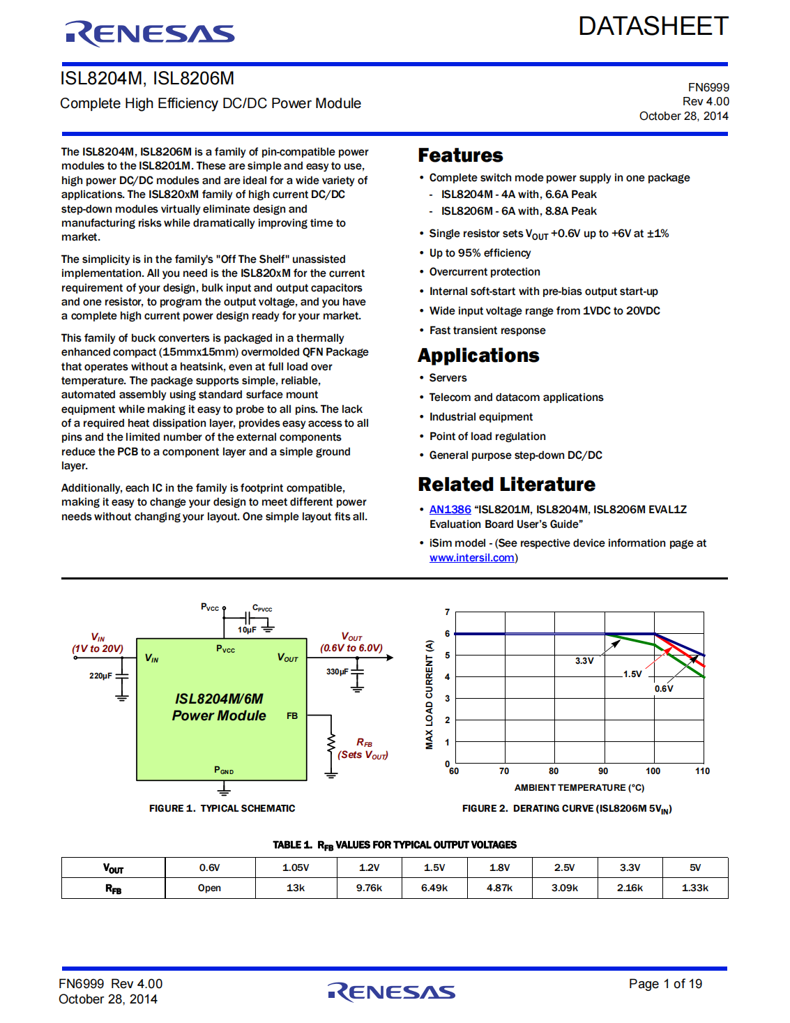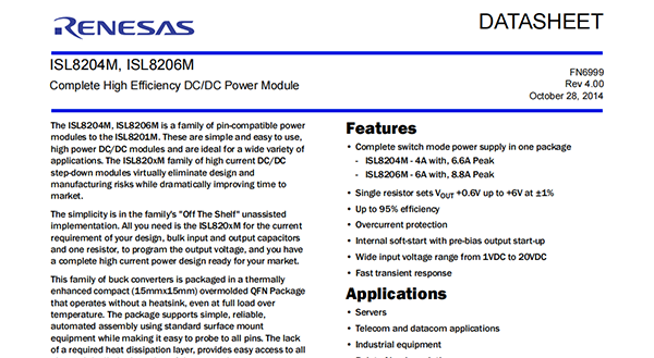 The ISL8204M,ISL8206M is a family of pin-compatible power modules to the ISL8201M.These are simple and easy to use,high power DC/DC modules and are ideal for a wide variety of applications.The ISL820xM family of high current DC/DC step-down modules virtually eliminate design and manufacturing risks while dramatically improving time to market.