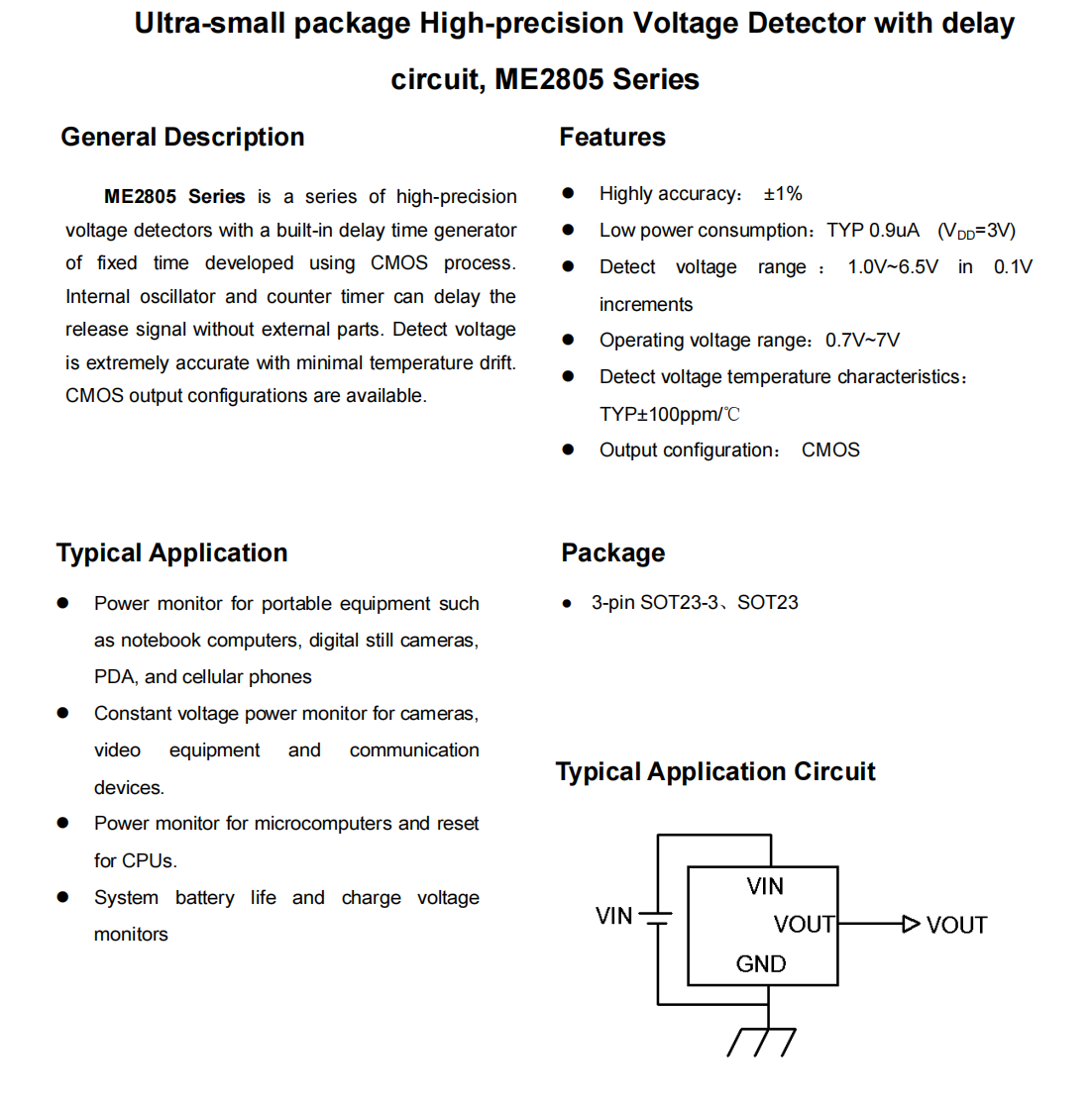 ME2805 Series is a series of high-precision voltage detectors with a built-in delay time generator of fixed time developed using CMOS process.Internal oscillator and counter timer can delay the release signal without external parts.Detect voltage is extremely accurate with minimal temperature drift.CMOS output configurations are available.