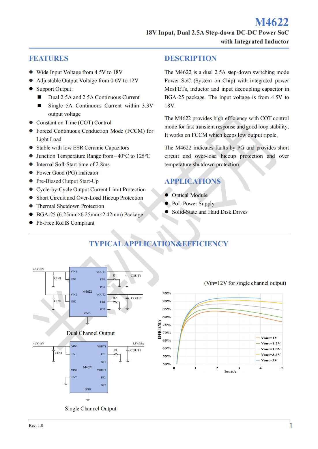 The M4622 is a dual 2.5A step-down switching mode Power SoC(System on Chip)with integrated power MosFETs,inductor and input decoupling capacitor in BGA-25 package.The input voltage is from 4.5V to 18V.
