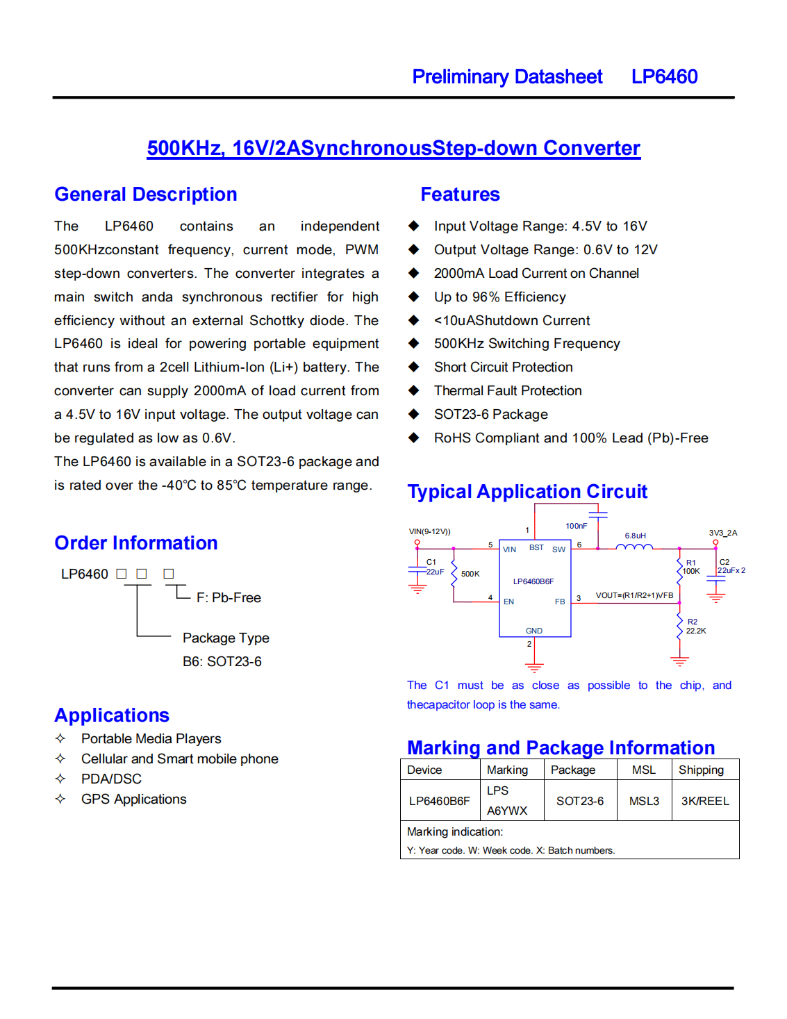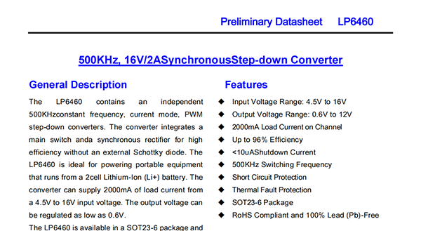 The LP6460 is ideal for powering portable equipment that runs from a 2cell Lithium-Ion(Li+)battery.Theconverter can supply 2000mA of load current from a 4.5V to 16V input voltage.The output voltage can be regulated as low as 0.6V.