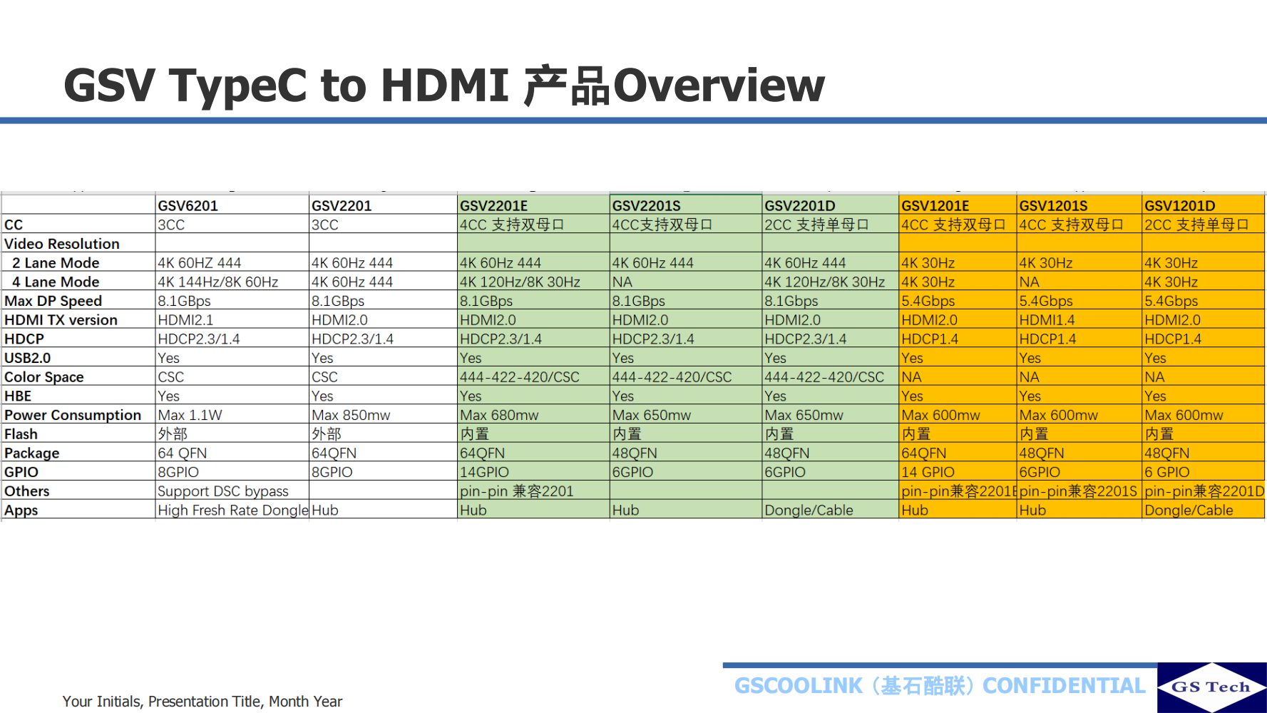 Gscoolink GSV2201D is a high-performance,low-power,USB Type-C Alternate Mode DisplayPort 1.2 to HDMI 2.0 converter.By integrating enhanced microcontroller and flash,GSV2201D has created a cost-effective solution that provides time-to-market advantages.The DisplayPort Receiver supports up to 21.6Gbps(HBR2,4-lane)and HDMI Transmitter supports up to 18Gbps(TMDS,6G3Lane).Integrated Power Delivery 3.0 controller handles Type-C CC interface for USB power management and DisplayPort mode entry.