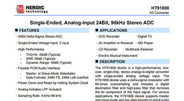 The HT91808 device is a high-performance,lowcost,single-chip,stereo analog-to-digital converter with single-ended analog voltage input.The HT91808 device uses a delta-sigma modulator with 64-times oversampling and includes a digital decimation filter and high-pass filter that removes the dc component of the input signal.For various applications,the HT91808 device supports master and slave mode and two data formats in serial audio interface