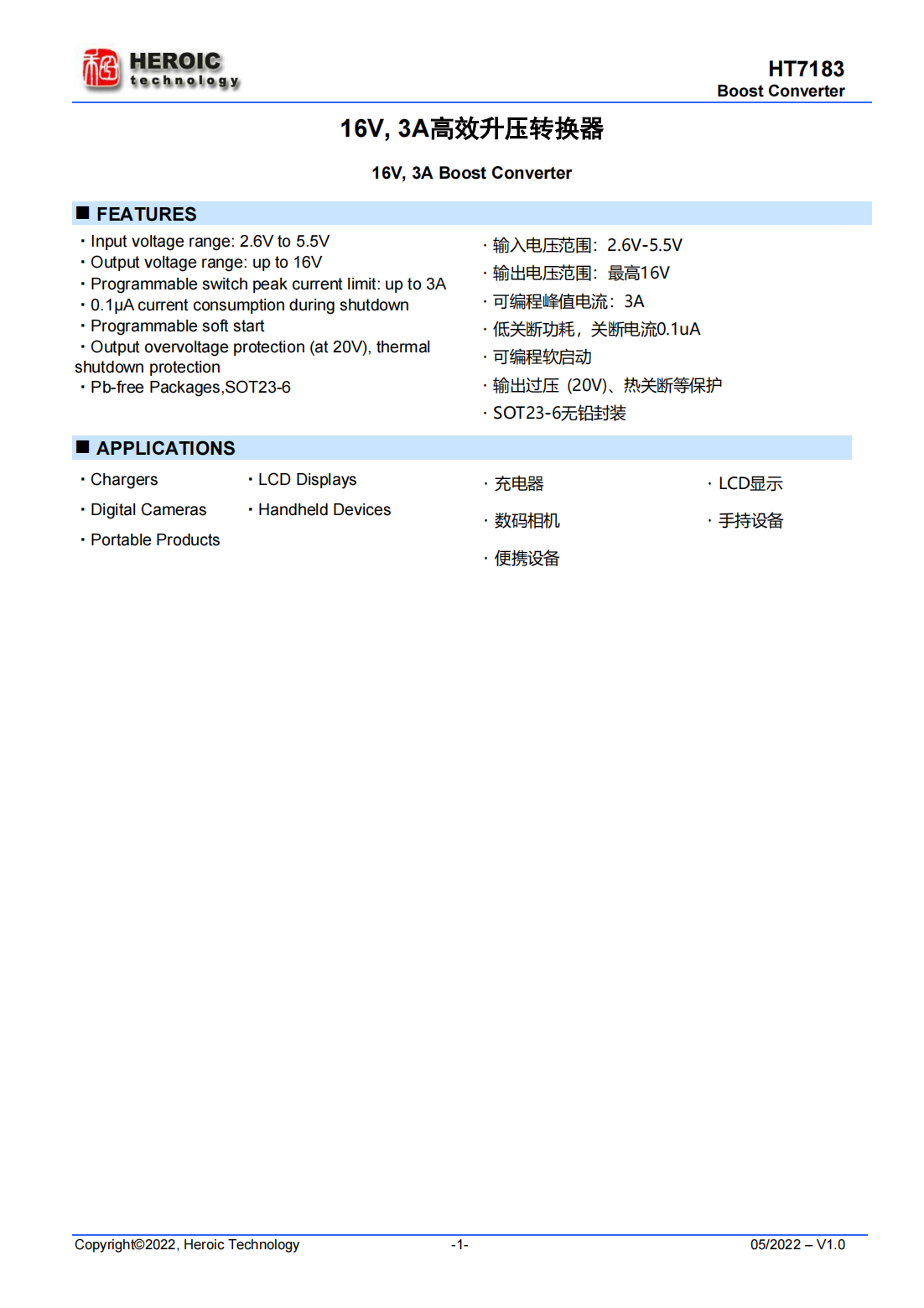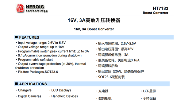 HT7183具有2.6V至5.5V輸入電壓范圍,可為各類(lèi)不同供電的應用提供支持。該器件具備3A開(kāi)關(guān)電流能力,并且能夠提供高達16V的輸出電壓。