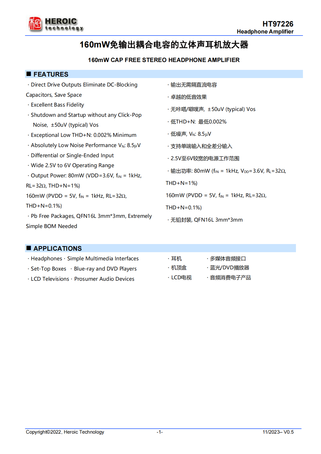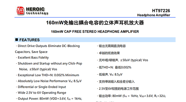 HT97226是一款差分輸入/單端輸入、可直接輸出驅動(dòng)的耳機放大器。5V供電時(shí),器件可為32ohm耳機提供180mW的功率。器件可通過(guò)外部電阻調節增益。器件在音頻范圍內具有卓越的THD+N表現。