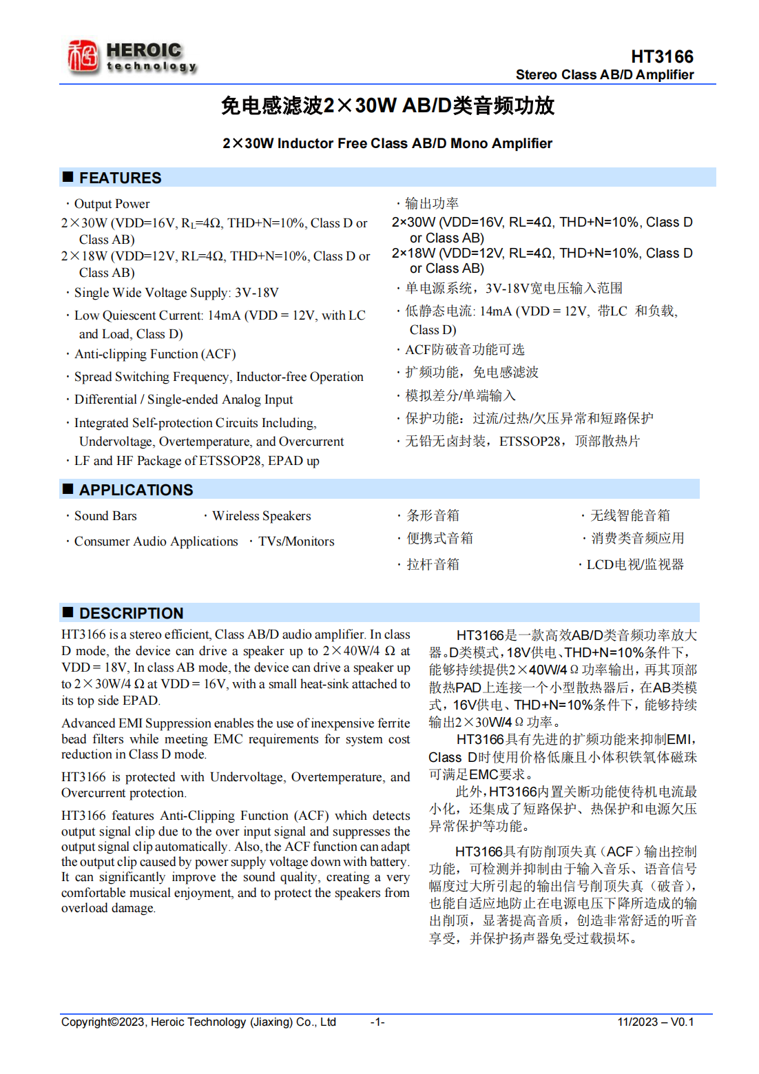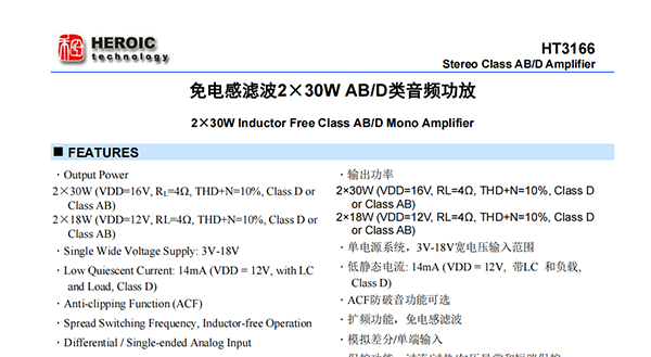 HT3166是一款高效AB/D類(lèi)音頻功率放大器。D類(lèi)模式,18V供電、THD+N=10%條件下,能夠持續提供2×40W/4Ω功率輸出,再其頂部散熱PAD上連接一個(gè)小型散熱器后,在A(yíng)B類(lèi)模式,16V供電、THD+N=10%條件下,能夠持續輸出2×30W/4Ω功率。