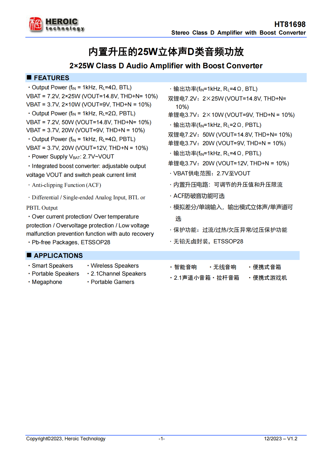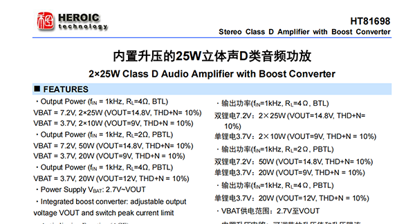 HT81698是一款內置升壓的立體聲D類(lèi)音頻功率放大器,其支持單節鋰電、雙節鋰電串聯(lián)、5V、12V等多種輸入,升壓后的電壓提供給功放供電,功放支持雙通道立體聲BTL輸出以及并聯(lián)PBTL單聲道輸出。