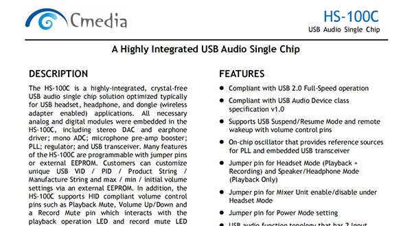 客戶(hù)可以通過(guò)外部EEPROM自定義獨特的USB VID/PID/產(chǎn)品串/制造串和最大/最小/初始音量設置。此外,HS-100C支持符合HID標準的音量控制引腳,如播放靜音、音量增大/減小和錄制靜音引腳,該引腳與播放操作LED和錄制靜音LED控制引腳交互。HS-100C還配備了抗爆裂噪聲電路設計和內部振蕩器,無(wú)需外部晶體振蕩器即可工作。