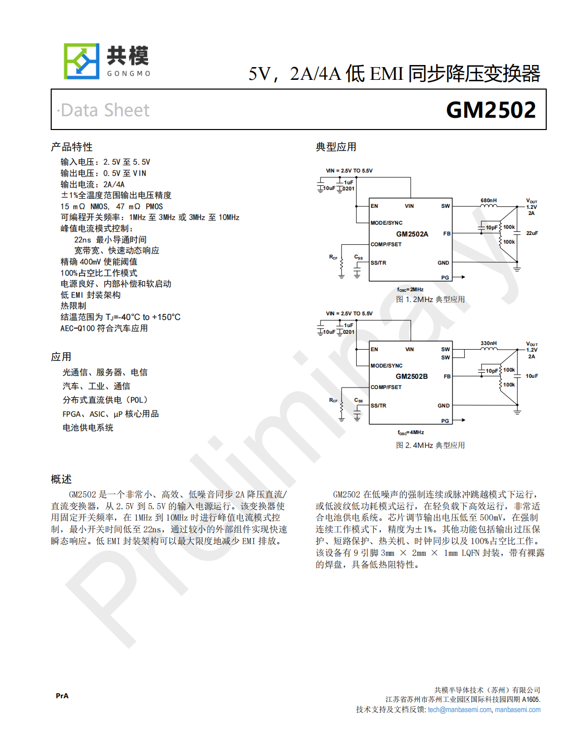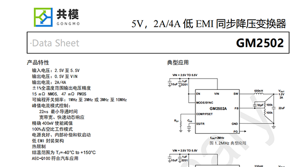 GM2502是一個(gè)非常小、高效、低噪音同步2A降壓直流/直流變換器,從2.5V到5.5V的輸入電源運行。該變換器使用固定開(kāi)關(guān)頻率,在1MHz到10MHz時(shí)進(jìn)行峰值電流模式控制,最小開(kāi)關(guān)時(shí)間低至22ns,通過(guò)較小的外部組件實(shí)現快速瞬態(tài)響應。低EMI封裝架構可以最大限度地減少EMI排放。