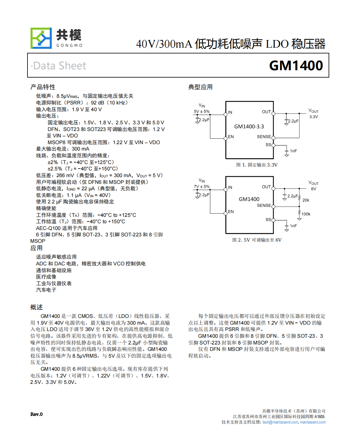 GM1400提供6種固定輸出電壓選項?,F有庫存提供下列電壓版本:1.2V(可調節)、1.22V(可調節)、1.5V、1.8V、2.5V、3.3V和5.0V。每個(gè)固定輸出電壓都可以通過(guò)外部反饋分壓器在初始設定點(diǎn)以上調整。這使GM1400可提供1.2V至VIN?VDO的輸出電壓且具有高PSRR和低噪聲。