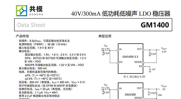 GM1400是一款CMOS、低壓差(LDO)線(xiàn)性穩壓器,采用1.9V至40V電源供電,最大輸出電流為300 mA。這款高輸入電壓LDO適用于調節36V至1.2V供電的高性能模擬和混合信號電路。該器件采用先進(jìn)的專(zhuān)有架構,在提供高電源抑制、低噪聲特性的同時(shí)保持低靜態(tài)電流,僅需一個(gè)2.2μF小型陶瓷輸出電容,便可實(shí)現出色的線(xiàn)路與負載瞬態(tài)響應性能。GM1400穩壓器輸出噪聲為8.5μVRMS,與5V及以下的固定選項輸出電壓無(wú)關(guān)。