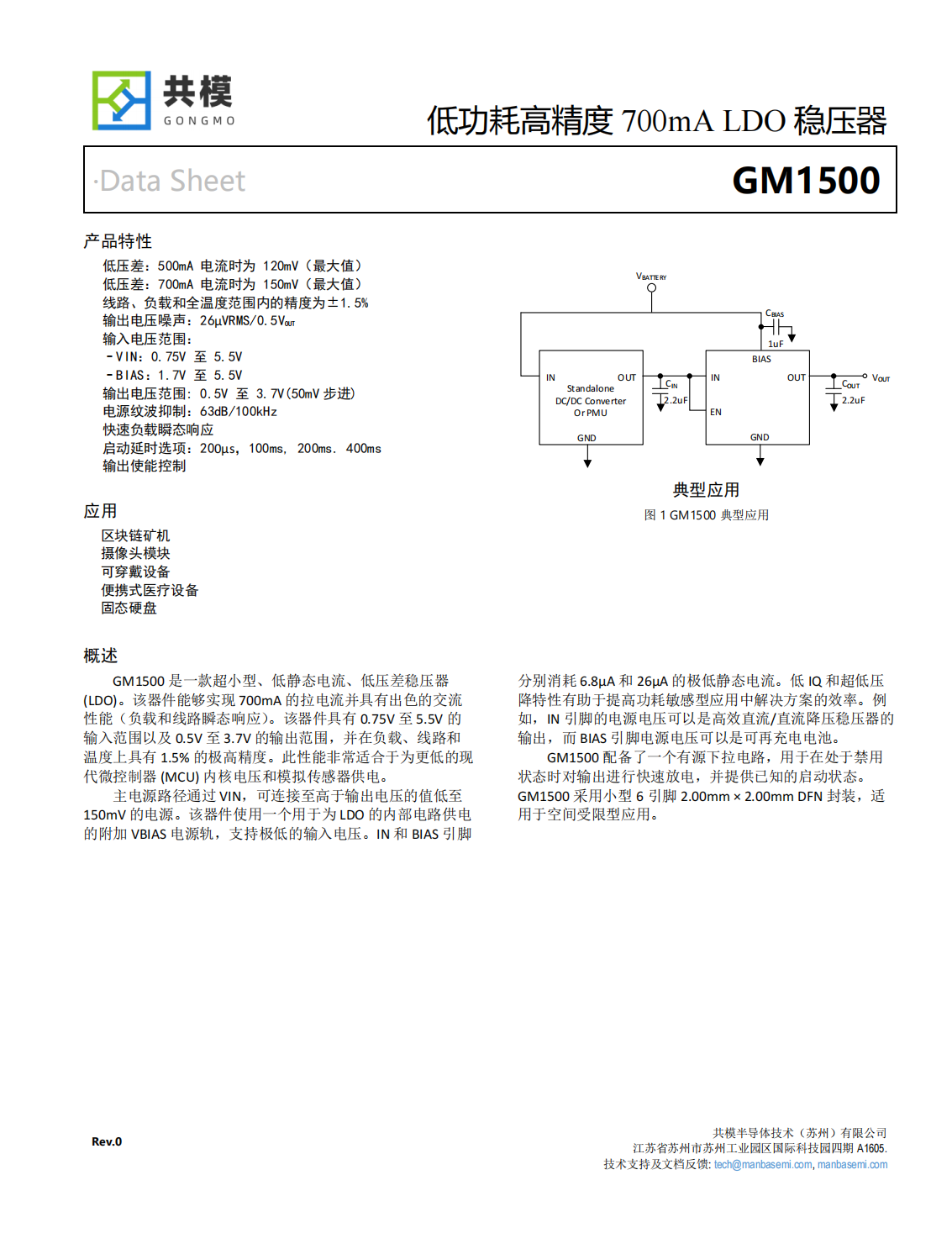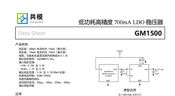 GM1500是一款超小型、低靜態(tài)電流、低壓差穩壓器(LDO)。該器件能夠實(shí)現700mA的輸出電流,具有0.75V至5.5V的輸入范圍以及0.5V至3.7V的輸出范圍,并在負載、線(xiàn)路和溫度上具有1.5%的極高精度。