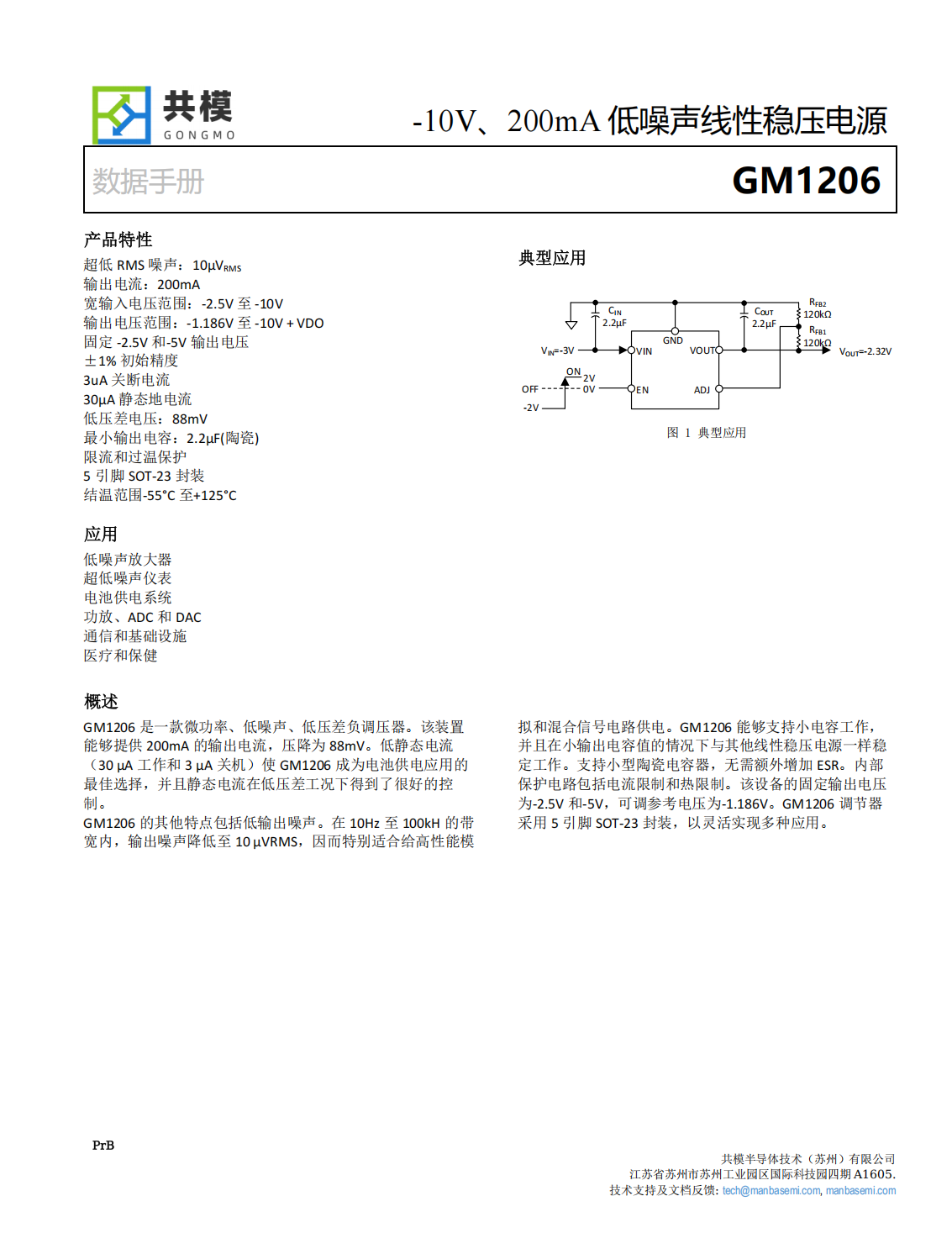 GM1206是一款微功率、低噪聲、低壓差負調壓器。該裝置能夠提供200mA的輸出電流,壓降為88mV。低靜態(tài)電流(30μA工作和3μA關(guān)機)使GM1206成為電池供電應用的最佳選擇,并且靜態(tài)電流在低壓差工況下得到了很好的控制。