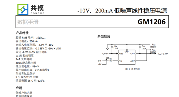 GM1206的其他特點(diǎn)包括低輸出噪聲。在10Hz至100kH的帶寬內,輸出噪聲降低至10μVRMS,因而特別適合給高性能模擬和混合信號電路供電。GM1206能夠支持小電容工作,并且在小輸出電容值的情況下與其他線(xiàn)性穩壓電源一樣穩定工作。支持小型陶瓷電容器,無(wú)需額外增加ESR。內部保護電路包括電流限制和熱限制。該設備的固定輸出電壓為-2.5V和-5V,可調參考電壓為-1.186V。GM1206調節器采用5引腳SOT-23封裝,以靈活實(shí)現多種應用。