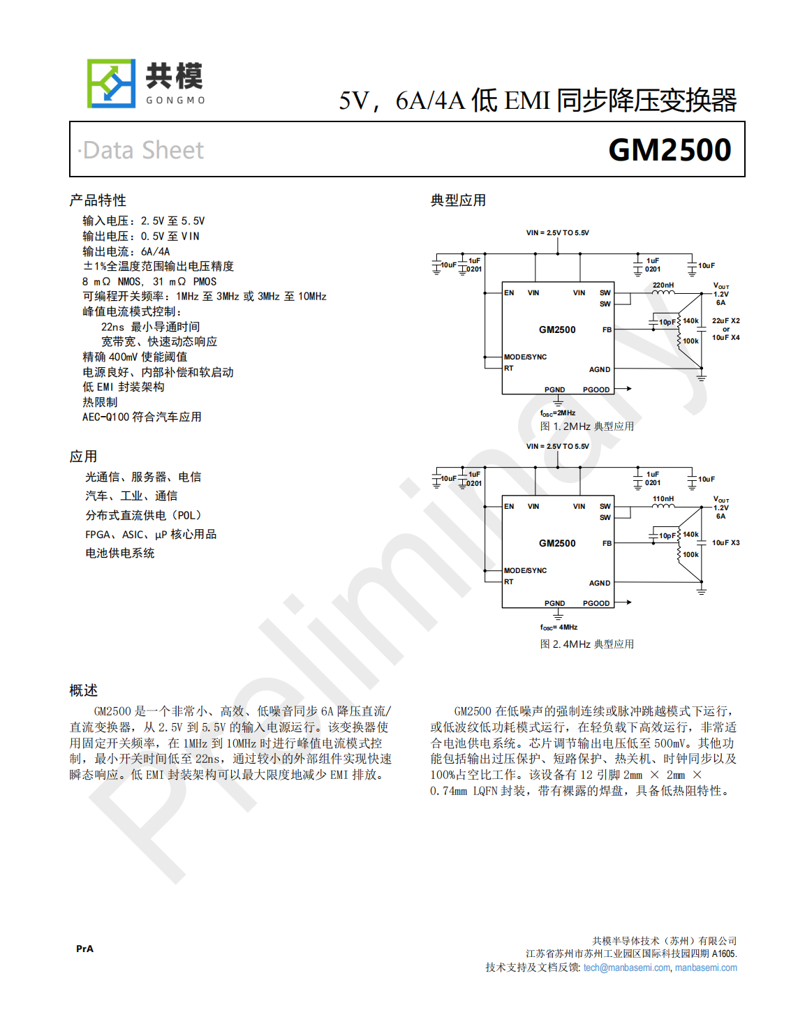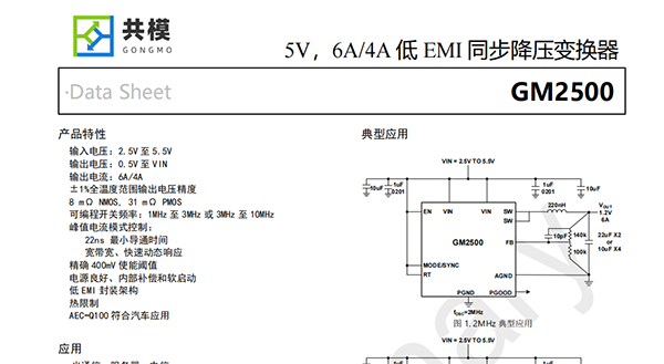 GM2500是一個(gè)非常小、高效、低噪音同步6A降壓直流/直流變換器,從2.5V到5.5V的輸入電源運行。該變換器使用固定開(kāi)關(guān)頻率,在1MHz到10MHz時(shí)進(jìn)行峰值電流模式控制,最小開(kāi)關(guān)時(shí)間低至22ns,通過(guò)較小的外部組件實(shí)現快速瞬態(tài)響應。低EMI封裝架構可以最大限度地減少EMI排放。
