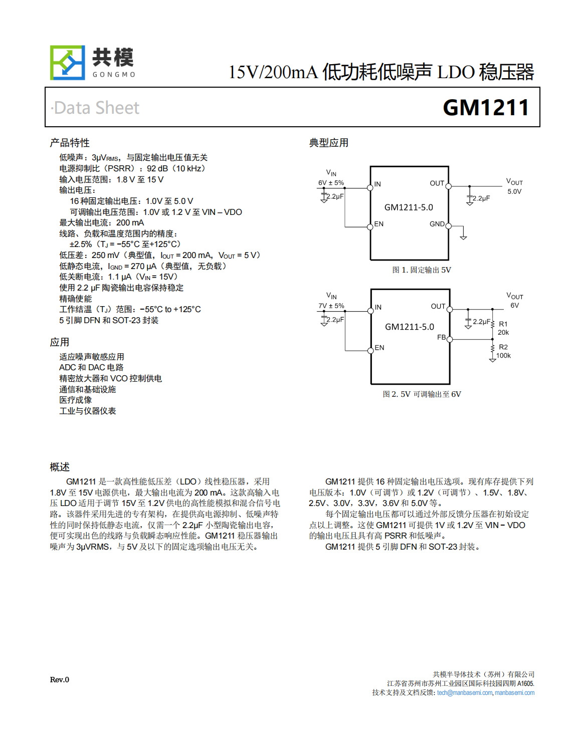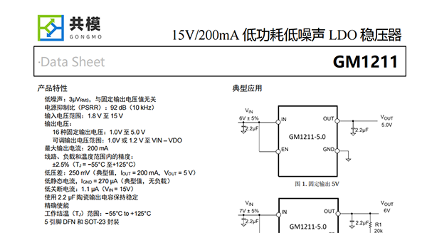 GM1211提供16種固定輸出電壓選項?,F有庫存提供下列電壓版本:1.0V(可調節)或1.2V(可調節)、1.5V、1.8V、2.5V、3.0V,3.3V,3.6V和5.0V等。每個(gè)固定輸出電壓都可以通過(guò)外部反饋分壓器在初始設定點(diǎn)以上調整。這使GM1211可提供1V或1.2V至VIN?VDO的輸出電壓且具有高PSRR和低噪聲。