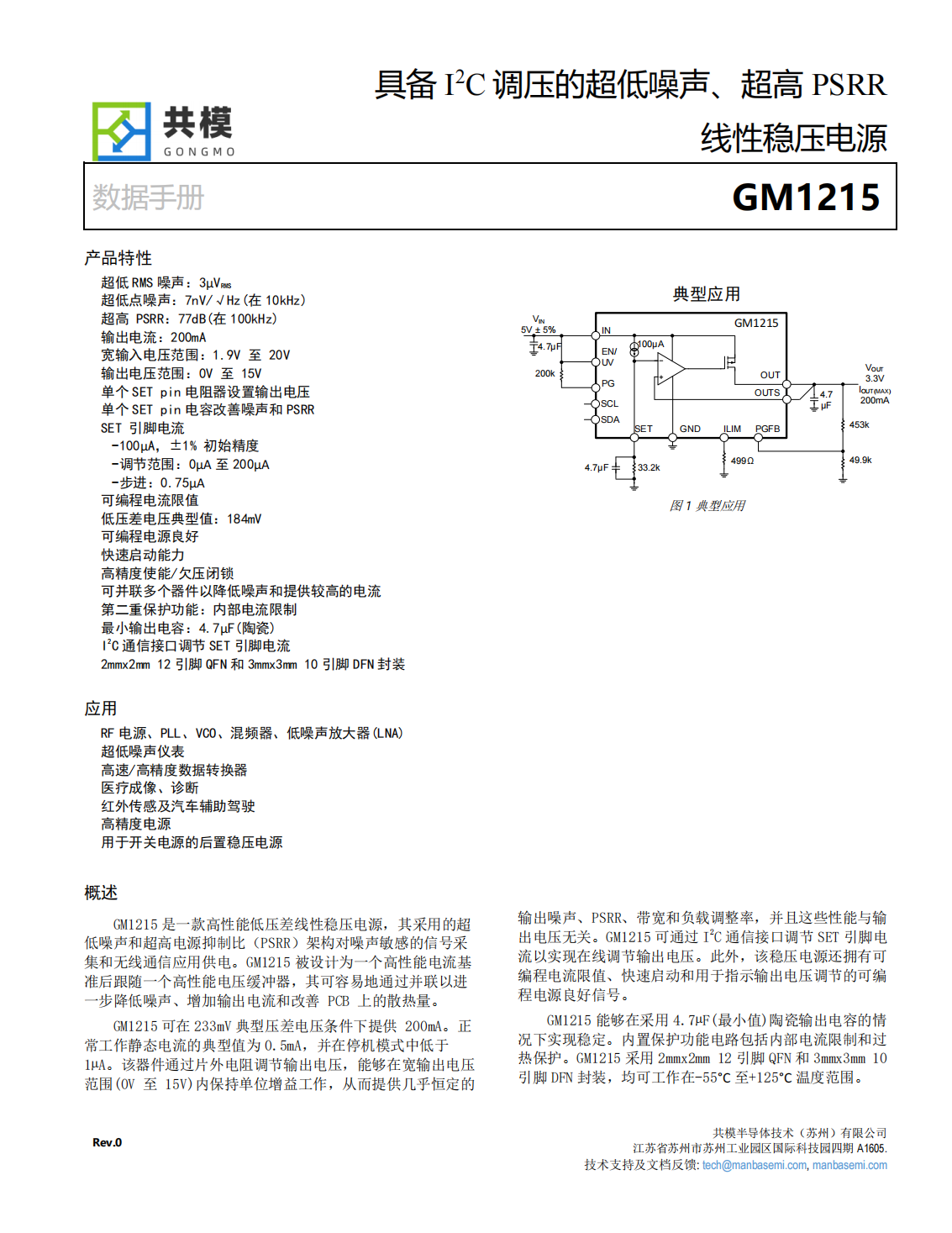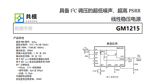 GM1215可在233mV典型壓差電壓條件下提供200mA。正常工作靜態(tài)電流的典型值為0.5mA,并在停機模式中低于1μA。該器件通過(guò)片外電阻調節輸出電壓,能夠在寬輸出電壓范圍(0V至15V)內保持單位增益工作,從而提供幾乎恒定的輸出噪聲、PSRR、帶寬和負載調整率,并且這些性能與輸出電壓無(wú)關(guān)。GM1215可通過(guò)I2C通信接口調節SET引腳電流以實(shí)現在線(xiàn)調節輸出電壓。此外,該穩壓電源還擁有可編程電流限值、快速啟動(dòng)和用于指示輸出電壓調節的可編程電源良好信號。